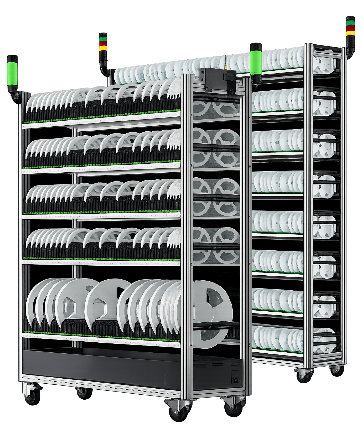 Система охватывает полный цикл движения SMD-катушек и других типов комплектующих — от адресного хранения до подачи на SMT-линию и возврата остатков.